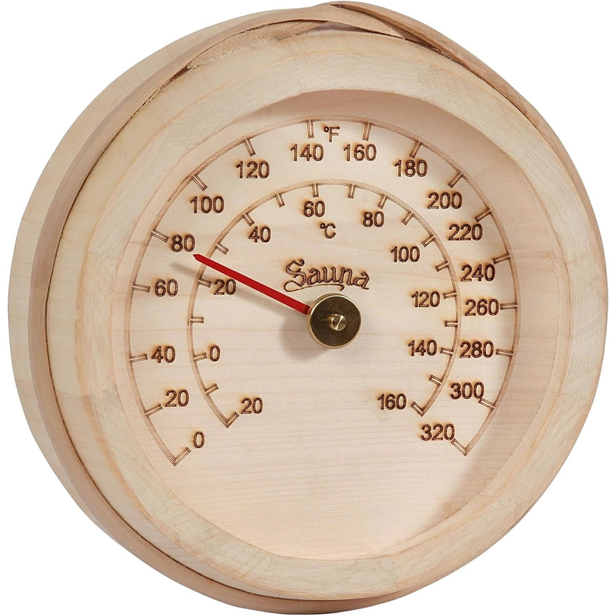 Aspen Bucket Bottom Thermometer F (8 3/4″ Diameter) gives you precise water-temperature control right inside your sauna bucket, helping you pour confidently and shape the feel of your löyly with intention. Designed to rest at the bottom of the pail, this analog thermometer provides real-time Fahrenheit readings so you can warm infusion water to the ideal range for gentler steam or more expressive aromatics—without guessing. The smooth, light-toned aspen face blends naturally with cedar and other classic sauna woods while resisting heat and moisture for long-lasting clarity. With its generous 8 3/4″ diameter, the dial is easy to read from the bench, and battery-free operation keeps your ritual calm and uninterrupted. Whether you're preparing herbal blends or simply fine-tuning every pour, this aspen thermometer helps protect your stones, reduce splashing, and maintain a perfectly tuned steam experience session after session.