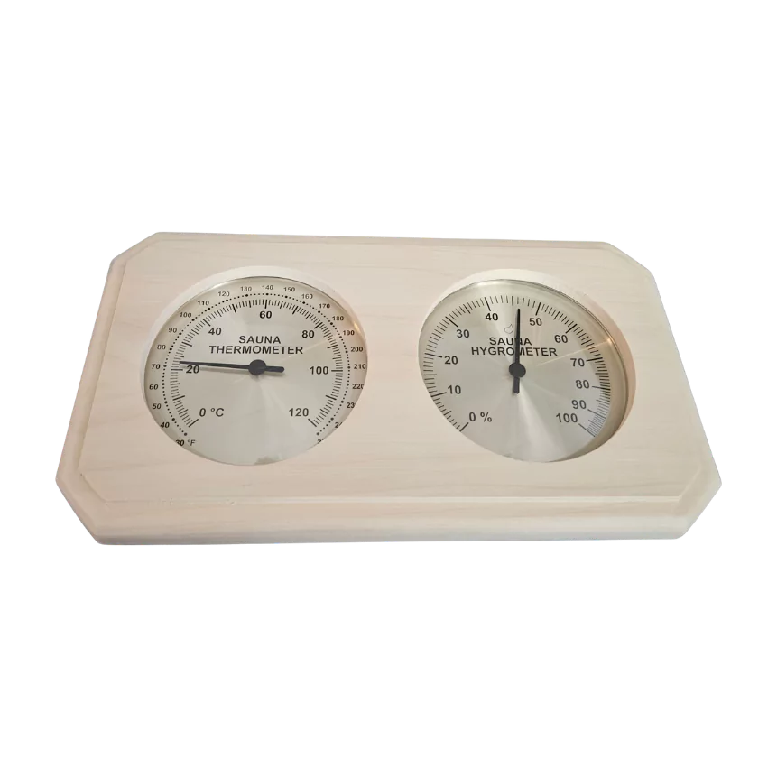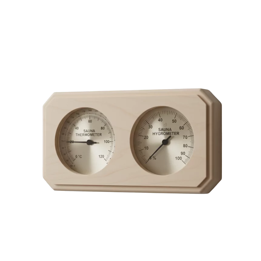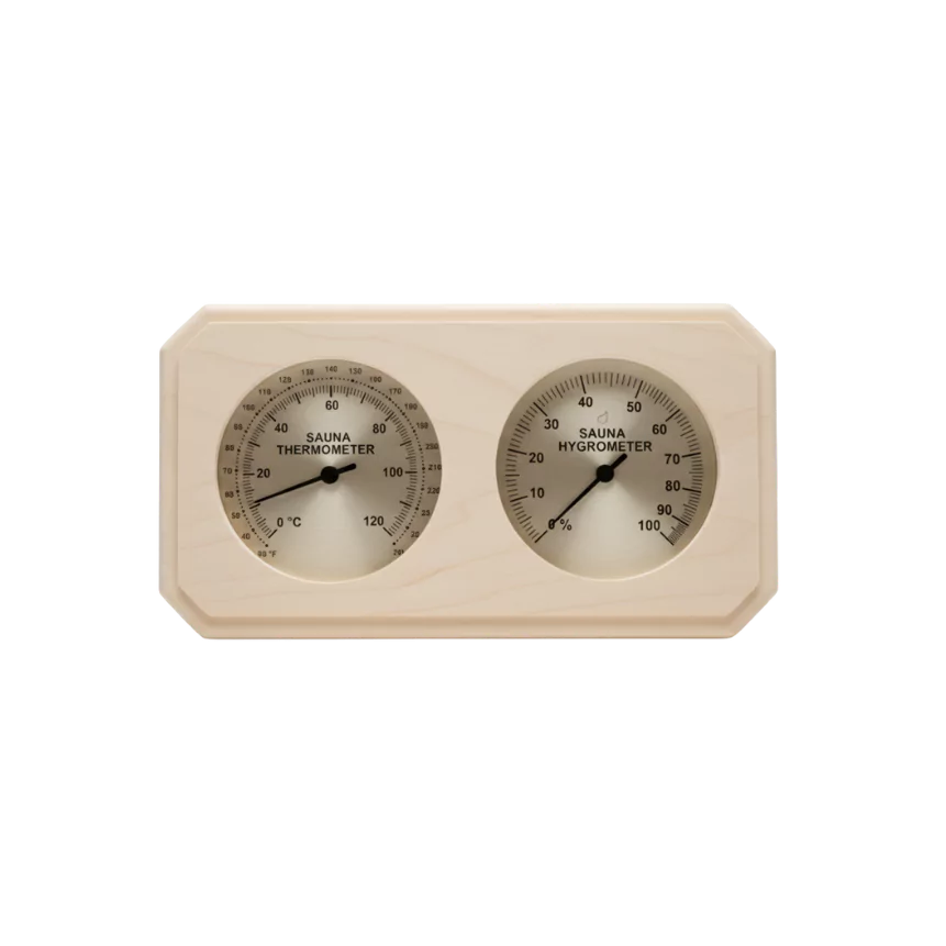 Aspen Encased Thermometer/Hygrometer C-F (10″ x 5 1/2″) offers precise, analog control over both sauna temperature and humidity in a light, modern wood frame. Crafted from smooth aspen, it resists heat and moisture while brightening your interior with a clean, natural finish. The clear glass face protects bold, dual-scale markings that display °F and °C alongside humidity readings, ensuring quick, accurate checks from any bench position. Designed for effortless wall mounting, this combination gauge keeps your sauna’s heat and moisture levels balanced for a more consistent, comfortable experience. Battery-free and built for longevity, it delivers quiet reliability and understated style, making it a refined and functional addition to both home and commercial saunas.