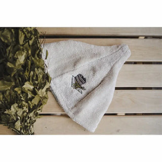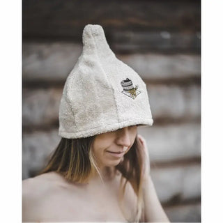 Beige sauna hat - Large is designed for bathers who want cooler, more comfortable sessions with a refined, naturally luxurious feel. Made in Northern Europe from a premium blend of 40% linen and 60% cotton, it offers the breathability and moisture-wicking performance linen is known for while staying soft against the skin. The roomy six-panel design, measuring approximately 27 inches in circumference, provides relaxed coverage that protects your head from the hottest upper-bench temperatures, helping you stay balanced and comfortable for longer rounds. Its neutral beige tone pairs easily with any sauna interior and complements other natural textiles. Durable stitching and quality fibers ensure the hat ages gracefully, becoming softer with each wash. Simple to care for and quick to air-dry, it is an elegant, functional accessory that enhances both comfort and tradition in your sauna routine.