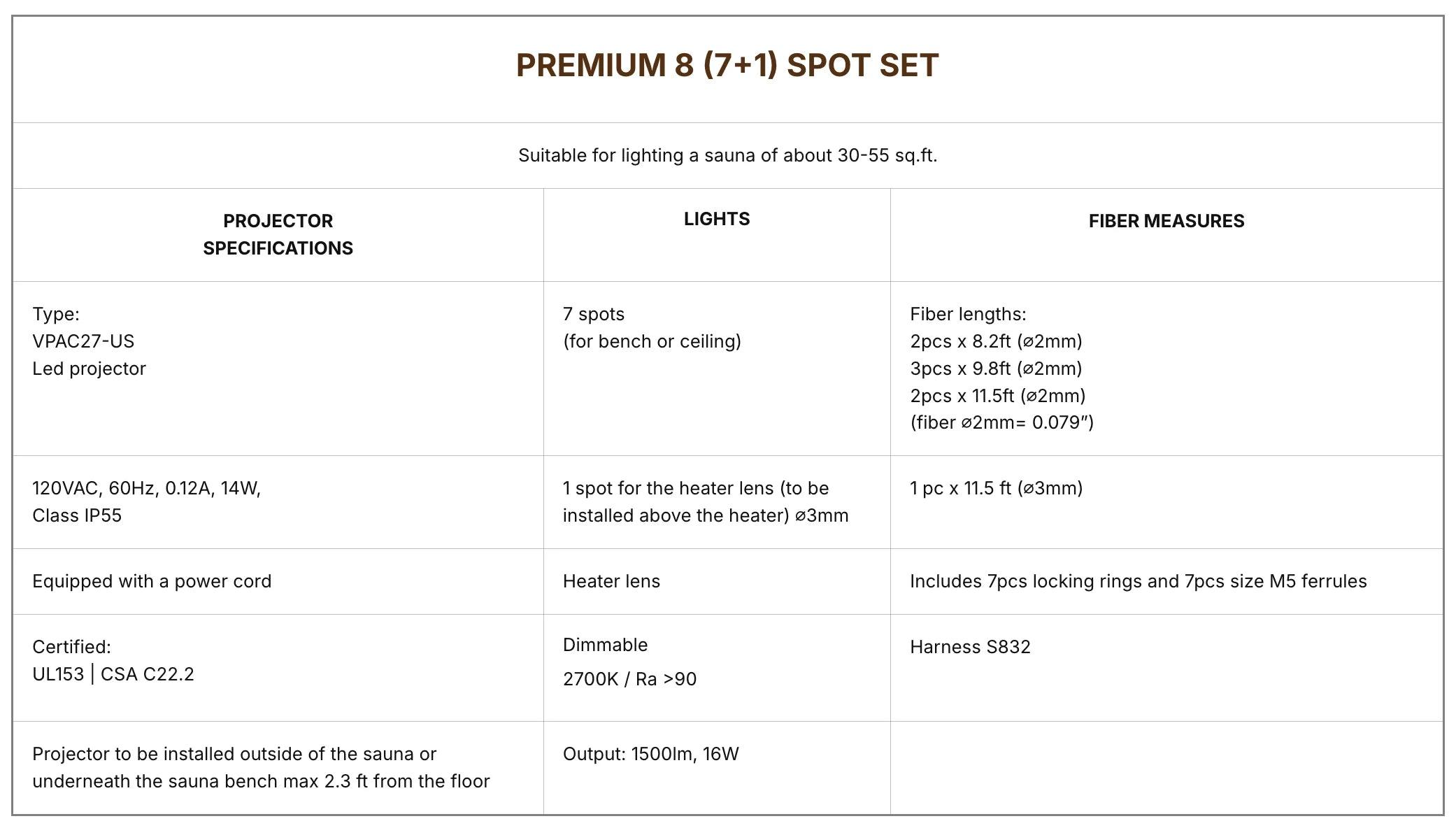 With three configurations available—8 spots, 11 spots, or 21 spots—these lighting sets can be tailored to fit your sauna’s size and design. Whether installed on the ceiling or benches, the lights produce a soft, warm glow (2700K) that accentuates the wood’s natural tones and elevates your sauna experience.