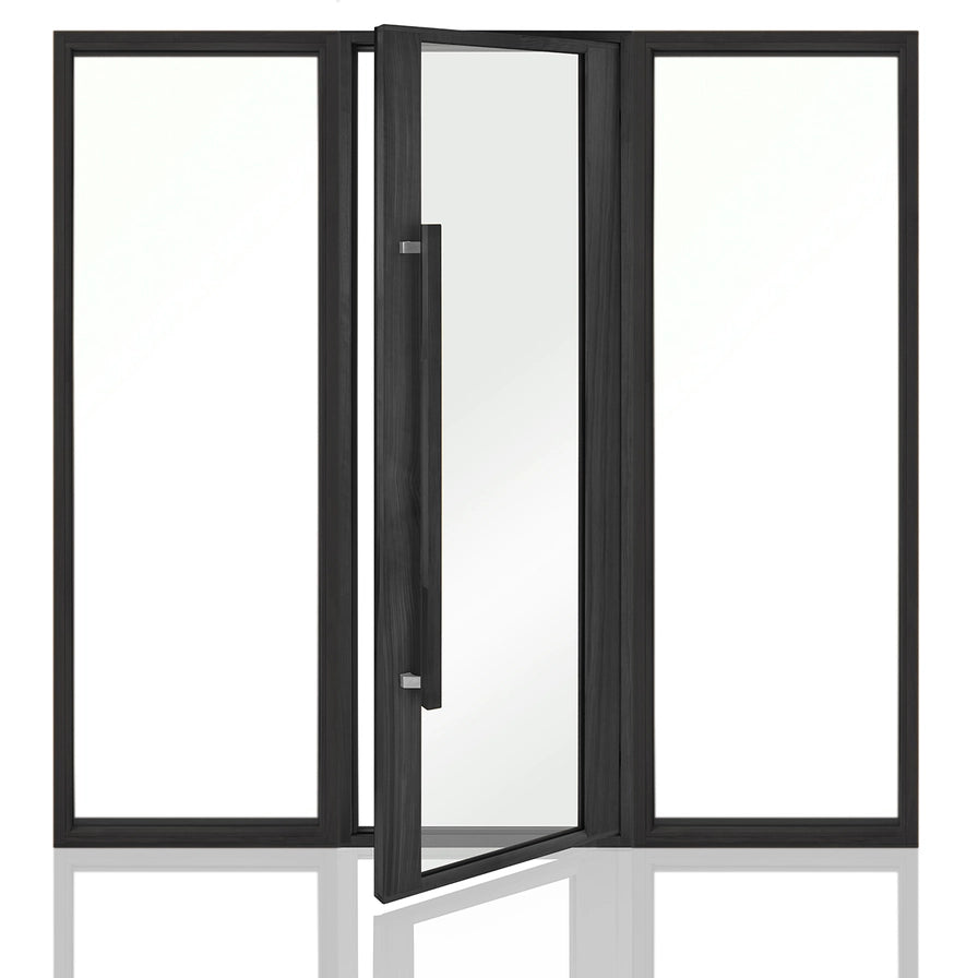 This glass wall system, sized at 6 ft wide and 7 ft tall, pairs clear glass panels with a black stained thermo aspen frame to give the sauna a bright, spacious feel with a strong modern edge. The layout uses a full-height central door and two fixed side panels to create a balanced, seamless front that opens the room visually while maintaining a refined built-in look. The clear glass maximizes light flow, helping compact sauna spaces feel larger, and the dark wood frame adds a bold contrast that works well with contemporary interiors. The door operates smoothly on hidden grey hinges and secures with a magnetic lock, while the matching black thermo aspen handle provides a cohesive finish and comfortable grip. Designed for modern upgrades or new builds, this system blends clean lines, warm wood, and open sightlines for a polished, glass-forward sauna entry.