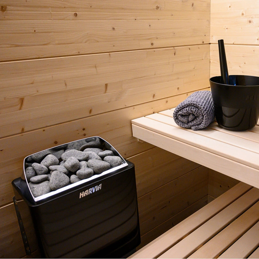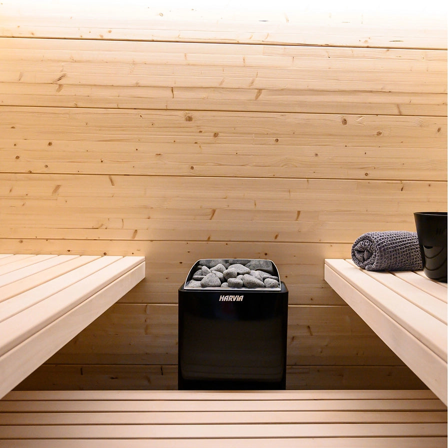Enjoy powerful, traditional sauna heat with the Harvia KIP80W in a sleek black finish. This 8.0kW wall-mounted heater is designed for sauna rooms up to 425 cubic feet, delivering consistent, efficient heat through direct rock-to-element contact.