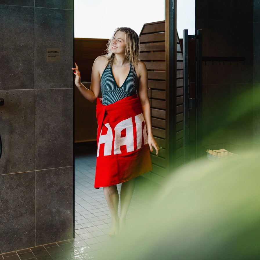 Harvia - Towel (27.56" × 55.12") Red is a soft, absorbent companion designed for those who want a premium wrap after every sauna round. Woven from 100% cotton in dense 600 GSM terrycloth, it delivers a plush, comforting feel that quickly draws moisture away from the skin as you cool down. The 70 x 140 cm size provides generous coverage without feeling bulky, making it equally suited for wrapping, lounging, or layering on a bench. Its rich red color adds a lively accent to your sauna, spa, or home bathroom while still looking refined and timeless. Responsibly manufactured in Europe and certified to OEKO-TEX® STANDARD 100, this towel supports higher standards of material safety and lasting quality, giving you a dependable everyday luxury for post-sauna relaxation and recovery.