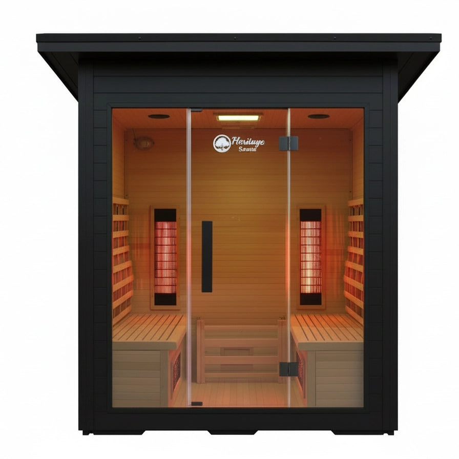 We designed the Heritage Lux IR Grand Pavilion Hybrid as the ultimate summit of outdoor wellness—a 4–6 person architectural sanctuary that brings commercial-grade recovery to your backyard. This is a private outdoor spa pavilion featuring a signature projecting eave roof (20 cm front / 15 cm sides) and a massive 6-foot by 6-foot footprint with recessed top and bottom panels for a built-in architectural finish.