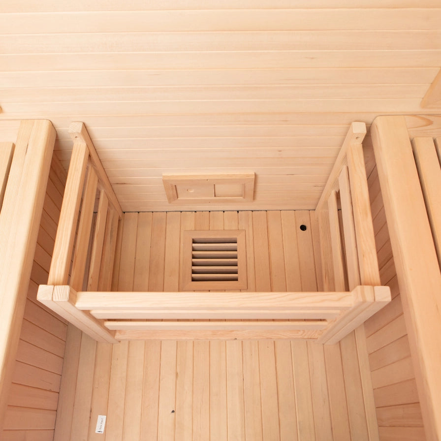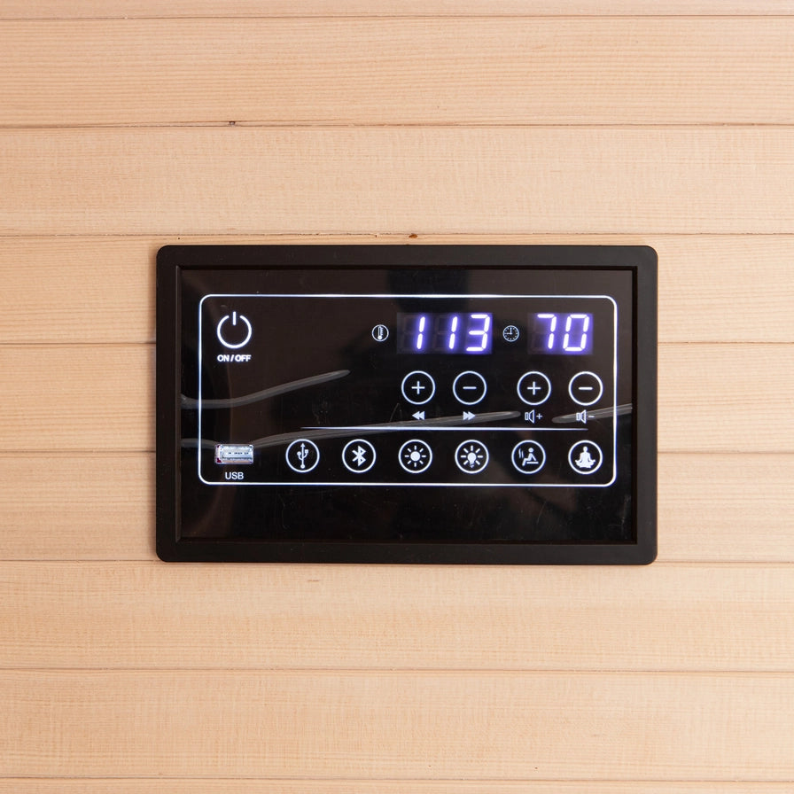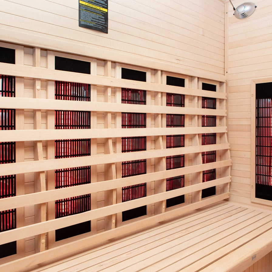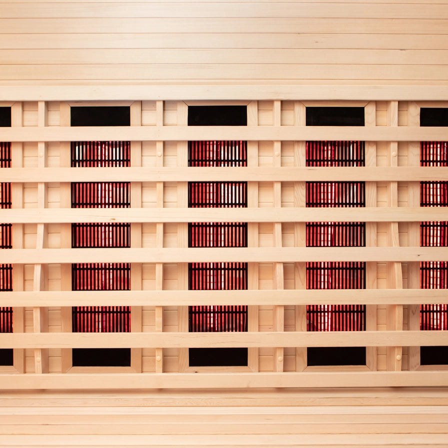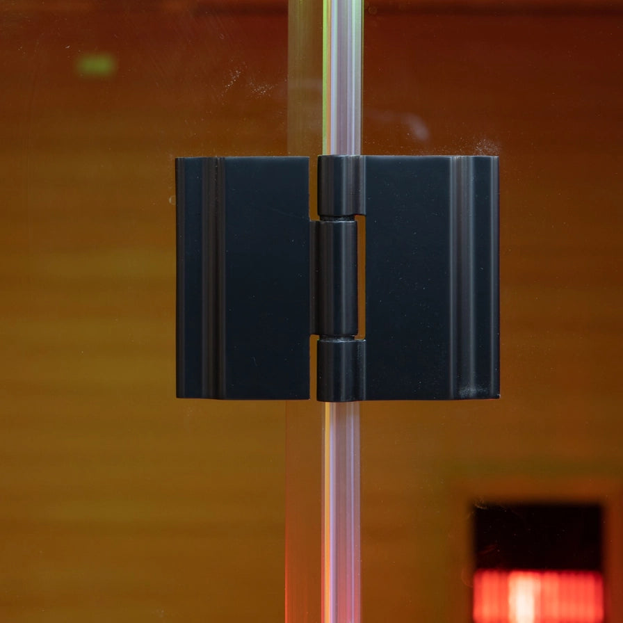 Under the hood, we engineered a dual-system powerhouse: a commercial-grade 5600 W ruby glass infrared array alongside a traditional Harvia Finnish stone heater. The 8 mm bronze privacy glass is finished with a vertical black wood handle (11" spacing) and a right-hand door swing. Whether you want a 180°F infrared recovery session or a classic Nordic "löyly" ritual, the Grand Pavilion delivers both in a rigid, thermally efficient insulated Hemlock cabin.