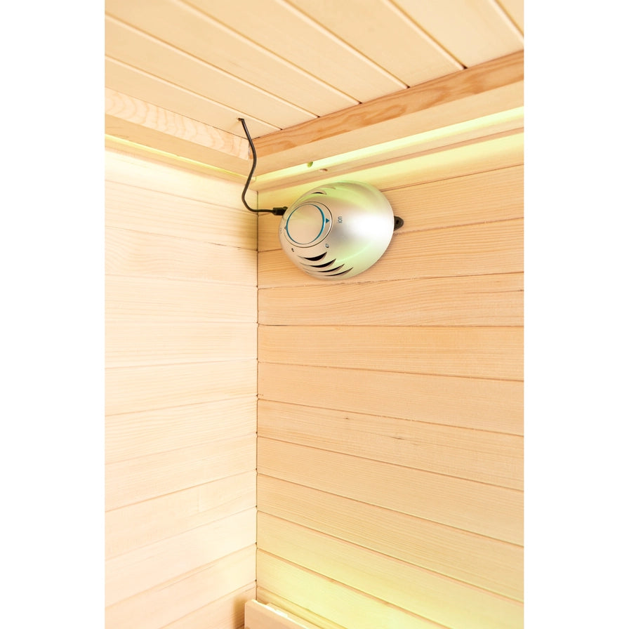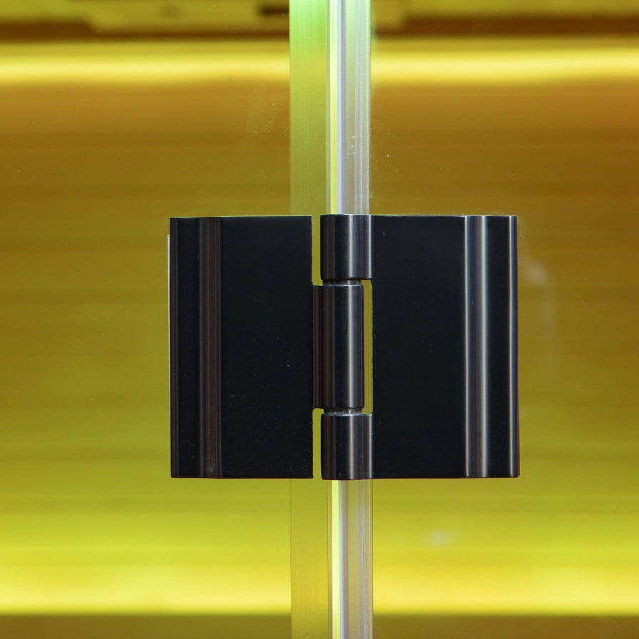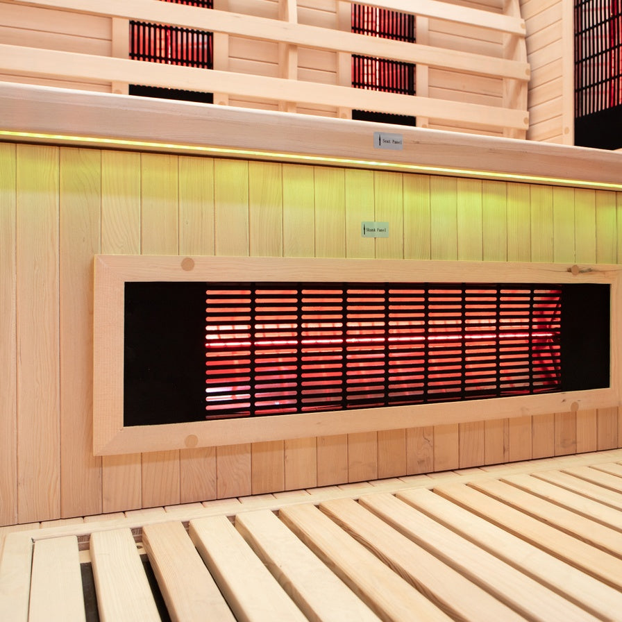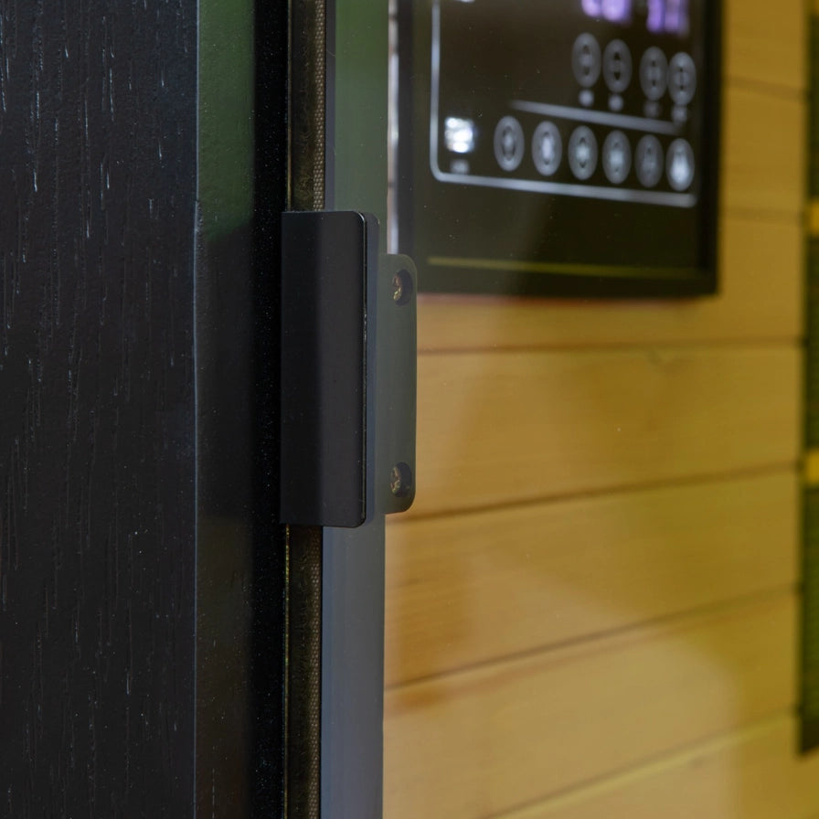 This isn't just about looks. Inside the fully insulated cabin, 7 high-intensity ruby glass emitters work in tandem with an exclusive 40" x 14" glass floor heater (245 W) to eliminate "cold feet" and provide a 360° deep-sweat experience. The 8mm bronze privacy glass is finished with a black wood handle (11" spacing) and a right-hand door swing. We built the Noir for those who find standard 120V saunas "too mild."
