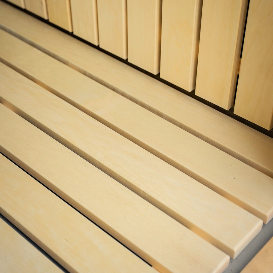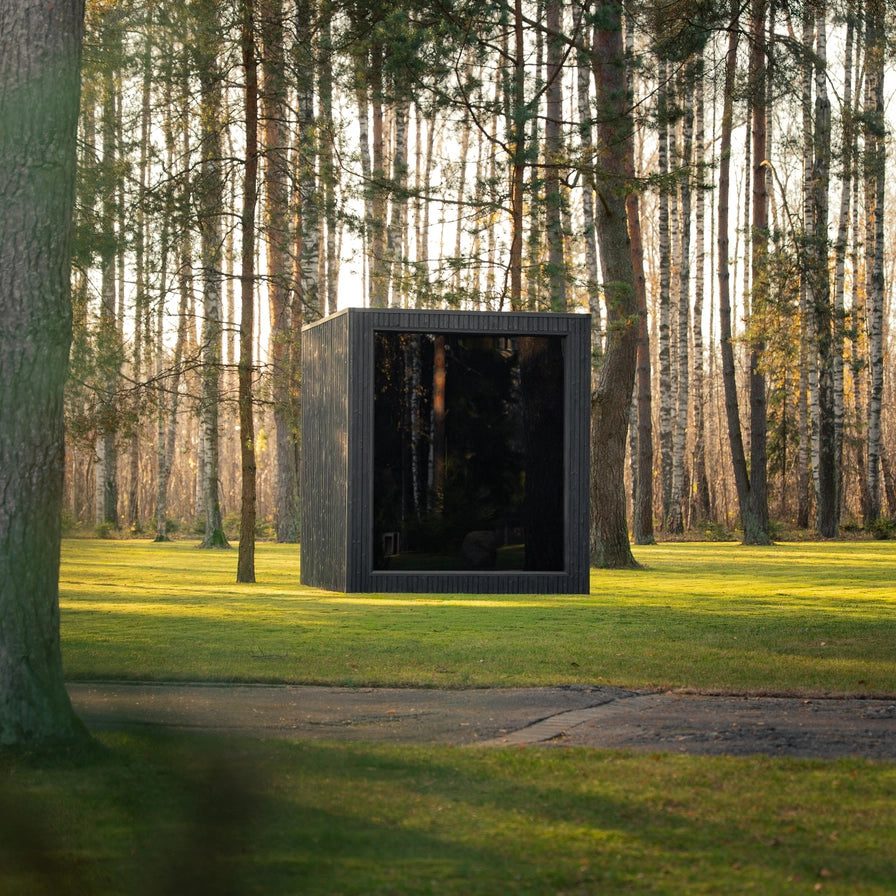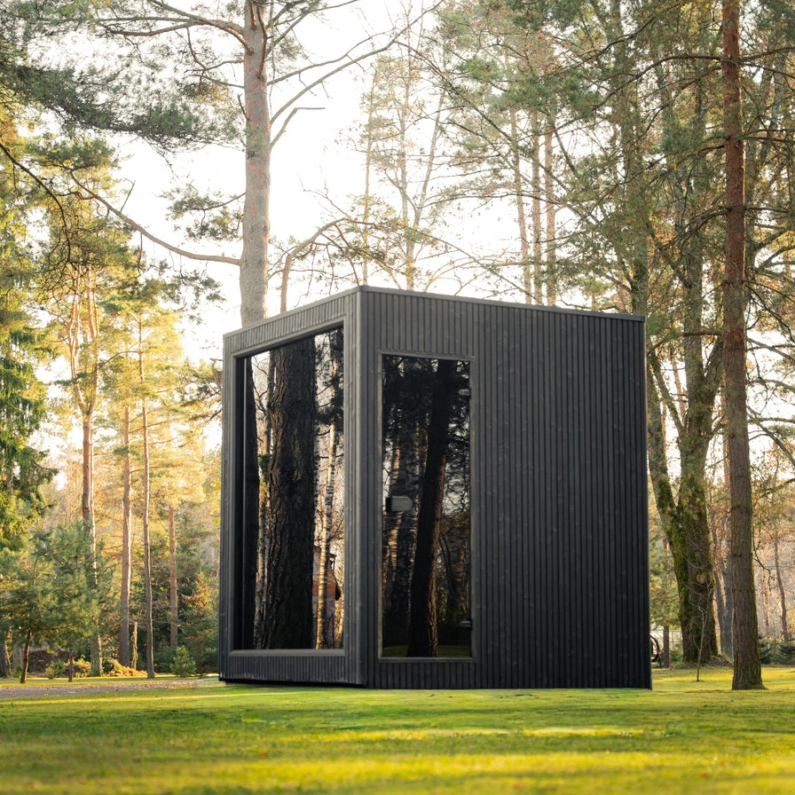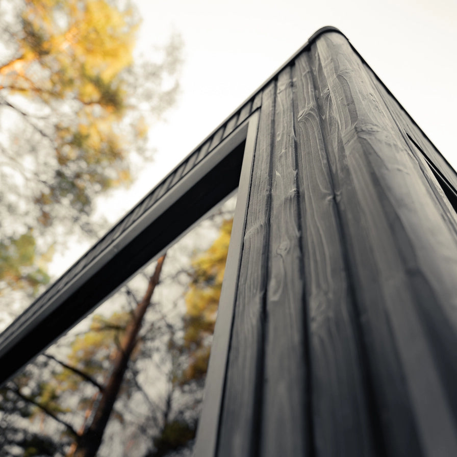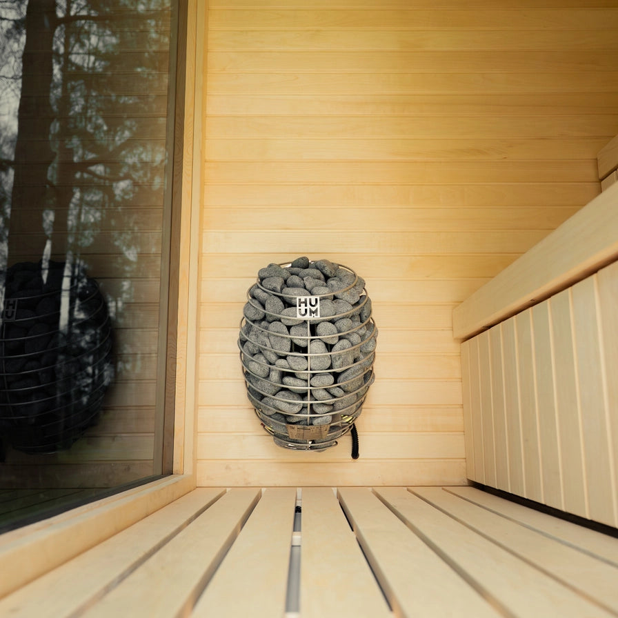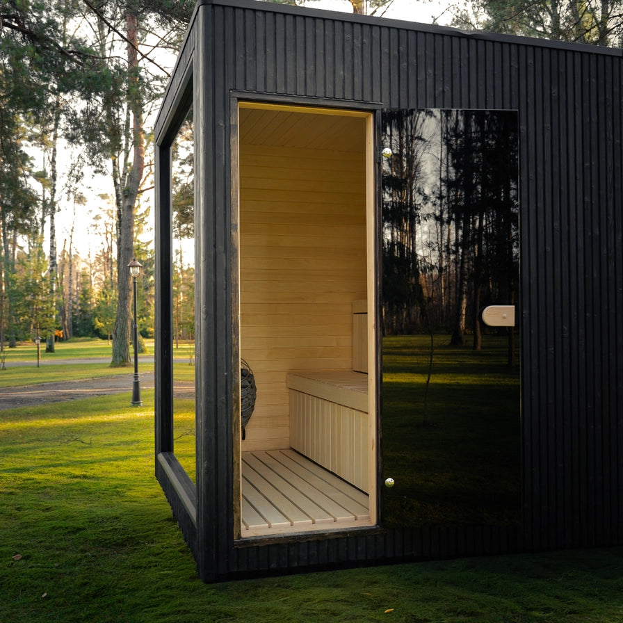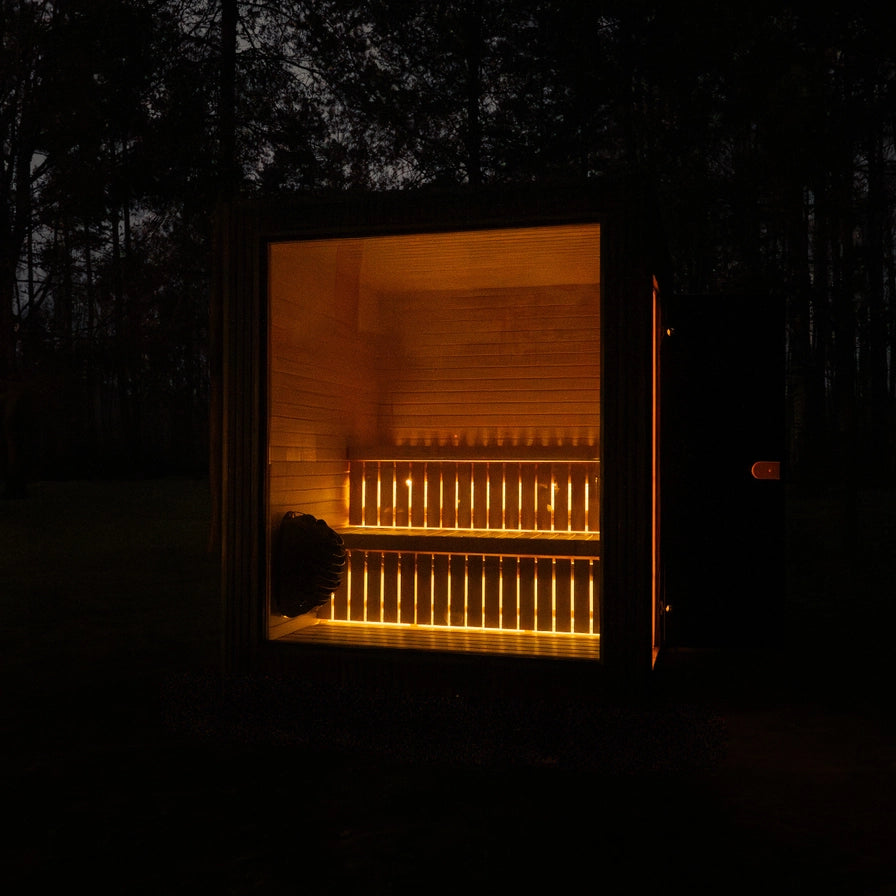 Stepping inside reveals a breathtaking "geode" effect: the dark, charred armor gives way to a luminous, pristine Aspen interior that feels soft to the touch and remains historically bright. Designed with a vertical "soft cube" silhouette, this sauna maximizes headroom and volume, while the expansive black-tinted glass front dissolves the boundary between the bather and the outdoors. Fully insulated for year-round US climates, the Stromboli Large offers a spacious, high-contrast retreat where modern design meets elemental power.