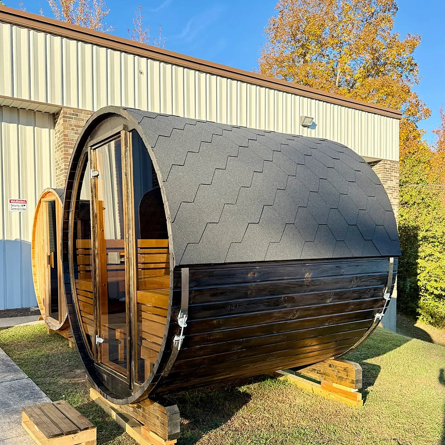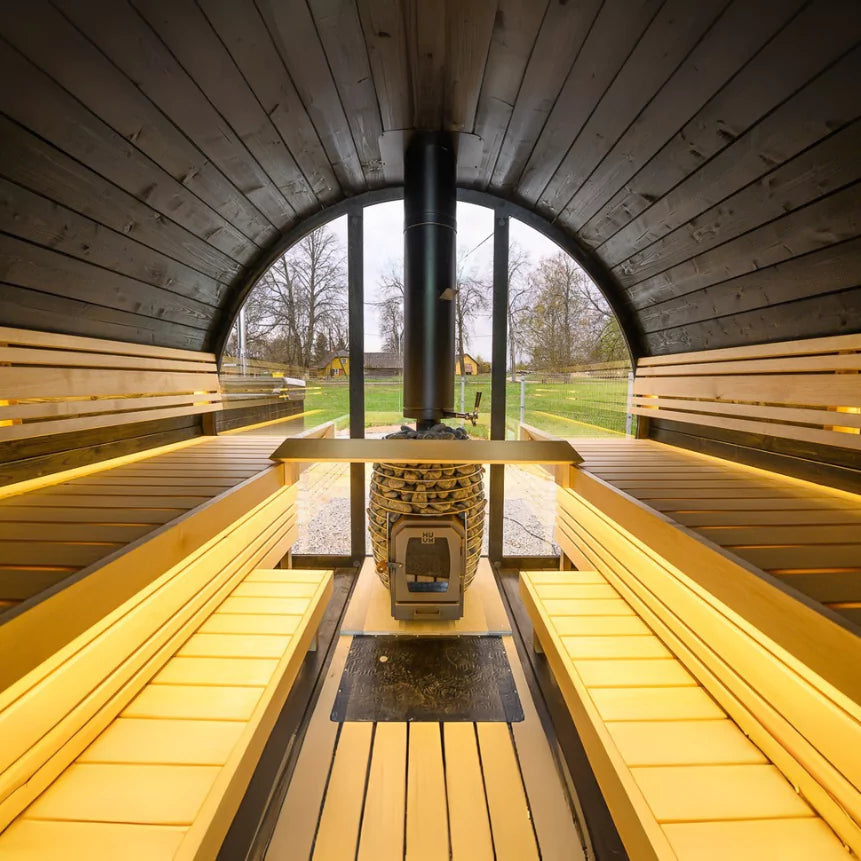 The Heritage Lux Vulcano is a handcrafted outdoor barrel sauna made in Northern Europe, designed to deliver a bold and luxurious wellness experience. Built for those who value both striking aesthetics and authentic performance, it features full-length tempered glass walls at the front and back, flooding the space with natural light and creating an unmatched open feel.