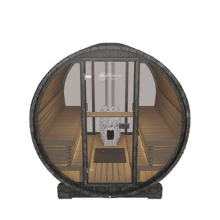 The Heritage Lux Vulcano is a professional-grade 6-person outdoor barrel sauna meticulously engineered for a bold, panoramic wellness experience, featuring full-length tempered glass walls at both the front and back. This model is the ideal solution for homeowners seeking architectural elegance and high-intensity thermal immersion, as its oversized 7' 9.5" diameter and raised Thermo Aspen benches position bathers higher in the heat zone for a more powerful "löyly" session. Handcrafted in Northern Europe from durable Thermo Pine and finished with weatherproof black shingles, the Lux Vulcano combines a striking black-stained modern aesthetic with a spacious, social interior designed for year-round outdoor durability. By integrating dual-glass transparency with authentic Finnish heat performance, this barrel sauna delivers the industry-standard balance of luxury design and structural longevity for any premium residential garden or visual centerpiece.