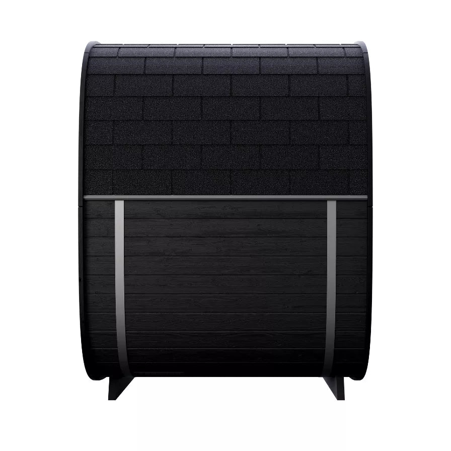 Note: Only the legs (which the sauna stands on), the side arches at the front and back, and the moldings around the door and windows are pre-painted black. The remaining exterior surfaces are left unpainted, with black paint provided for final finishing on site.
