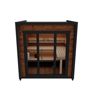 The Leil Saunas Patio XS 4 Person Outdoor Sauna Kit is a premium outdoor sauna that blends modern design with outstanding functionality. Crafted from thermally modified wood for superior durability and long-term weather resistance, this model is perfectly suited for patios, terraces, and garden environments.