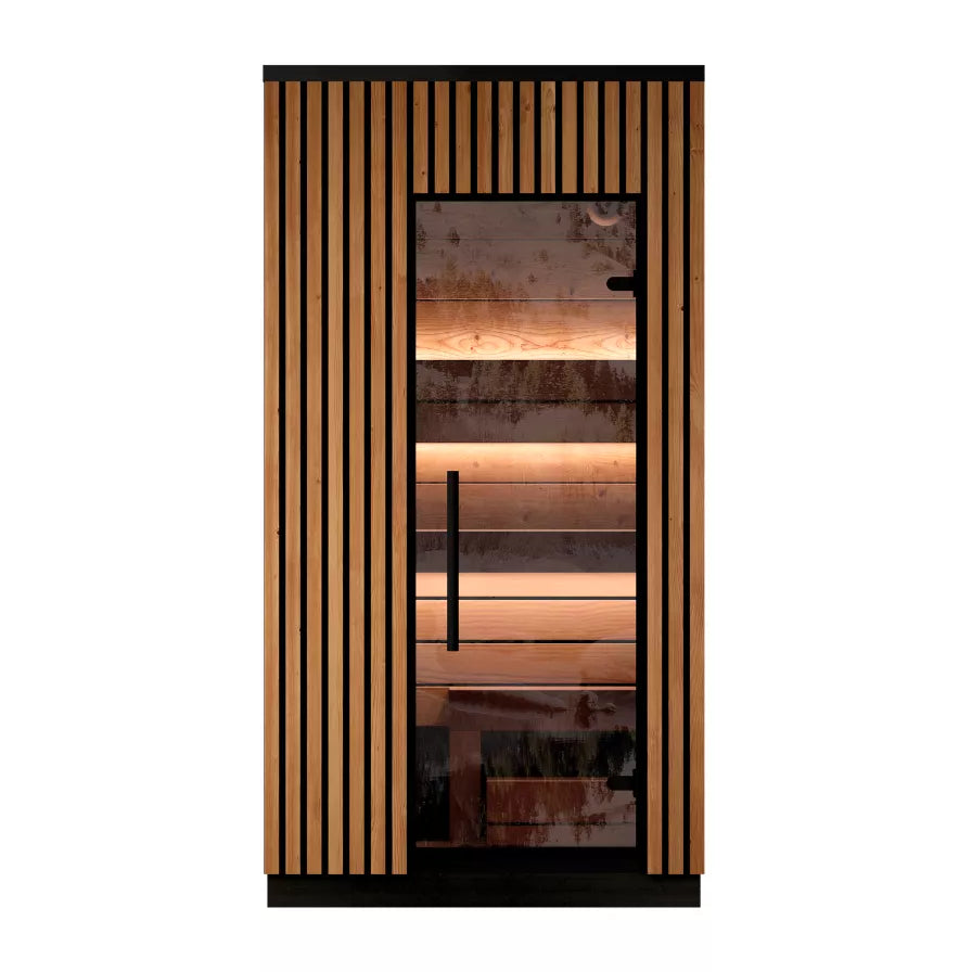 The Viva 120 is a compact, premium outdoor sauna designed for solo relaxation and minimalist living. Built with durable 1.57" ThermoWood®, this modern 1-person sauna offers clean architectural lines, a warm, natural interior, and smart ventilation for an authentic leil experience. Whether placed on a terrace, rooftop, or tucked into a quiet garden corner, the Viva 120 brings everyday wellness within reach. Optional LED lighting and a decorative hexagon back panel add extra ambiance to your personal retreat.