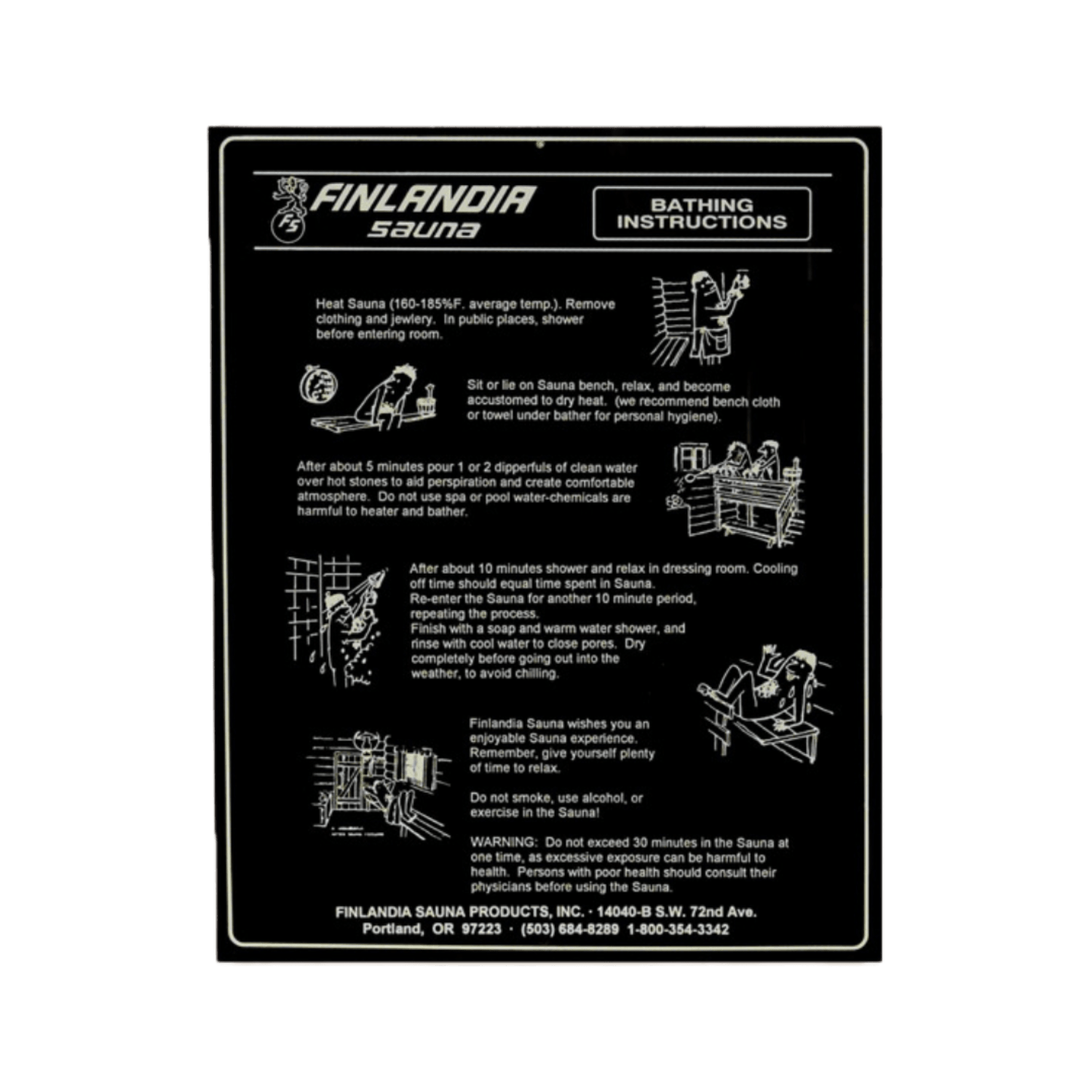 The Plexiglas Bathing Instruction Sign is a durable and essential addition to any sauna, designed to provide clear instructions for a safe and enjoyable sauna experience. Measuring 8 inches in width and 10 inches in height, this sign is made from high-quality Plexiglas, ensuring it can withstand the heat and humidity of sauna environments. Its clear and concise guidelines help users understand proper sauna practices, promoting a safe and relaxing atmosphere.