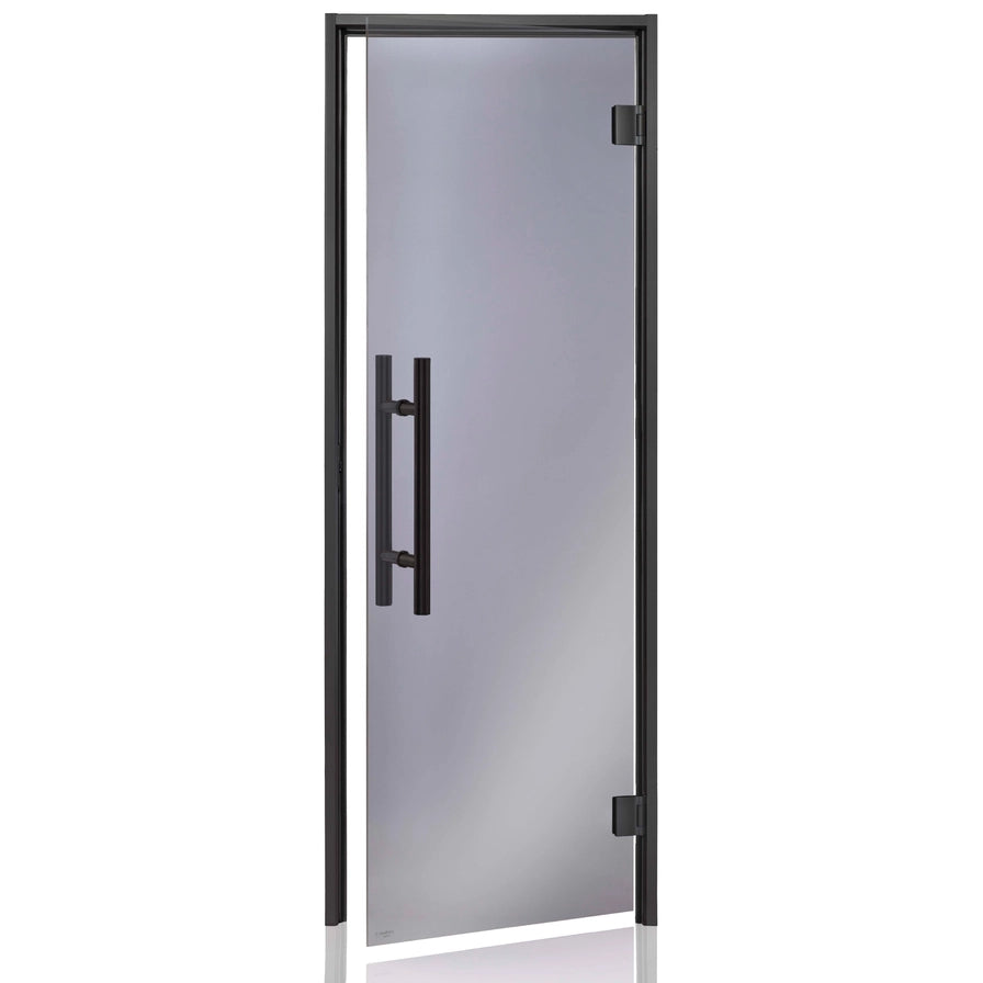 Upgrade the look and functionality of your sauna or steam room with the Premium Black Sauna/Steam Room Door featuring elegant grey glass. This door combines modern aesthetics with durable construction, making it a perfect addition to any wellness space. Measuring 24 1/2″ x 80 1/8″, the door is framed with black anodized aluminum, providing a sleek and contemporary appearance. The grey tempered glass adds a touch of sophistication while maintaining privacy and enhancing the room's ambiance. Equipped with mini premium handles and hinges, this door ensures smooth operation and a refined finish. Ideal for those seeking both style and performance in their sauna or steam room setup.