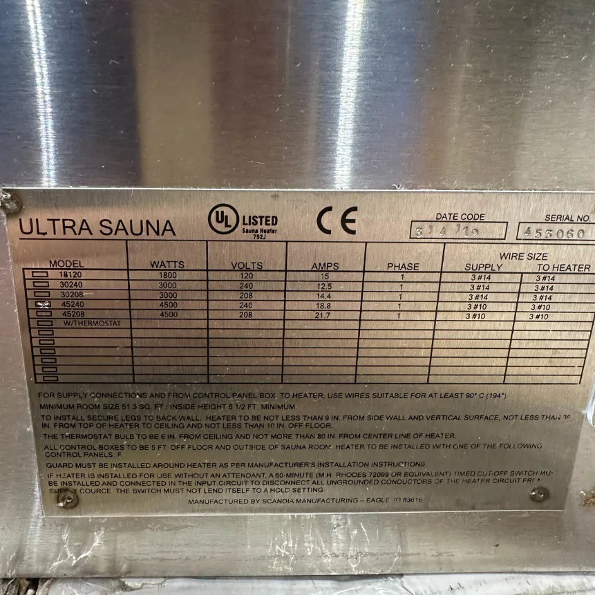 This Scandia Ultra 45240 electric sauna heater is discounted due to rust and scuff marks on the front lower right corner of the casing, along with dents in the included control unit. Despite the cosmetic flaws, this heater is fully operational and built to deliver reliable performance in sauna rooms up to 210 cubic feet. Proudly made in the USA, the 45240 model combines stainless steel construction, efficient heat delivery, and a smart steam system for a dependable, dry sauna experience.