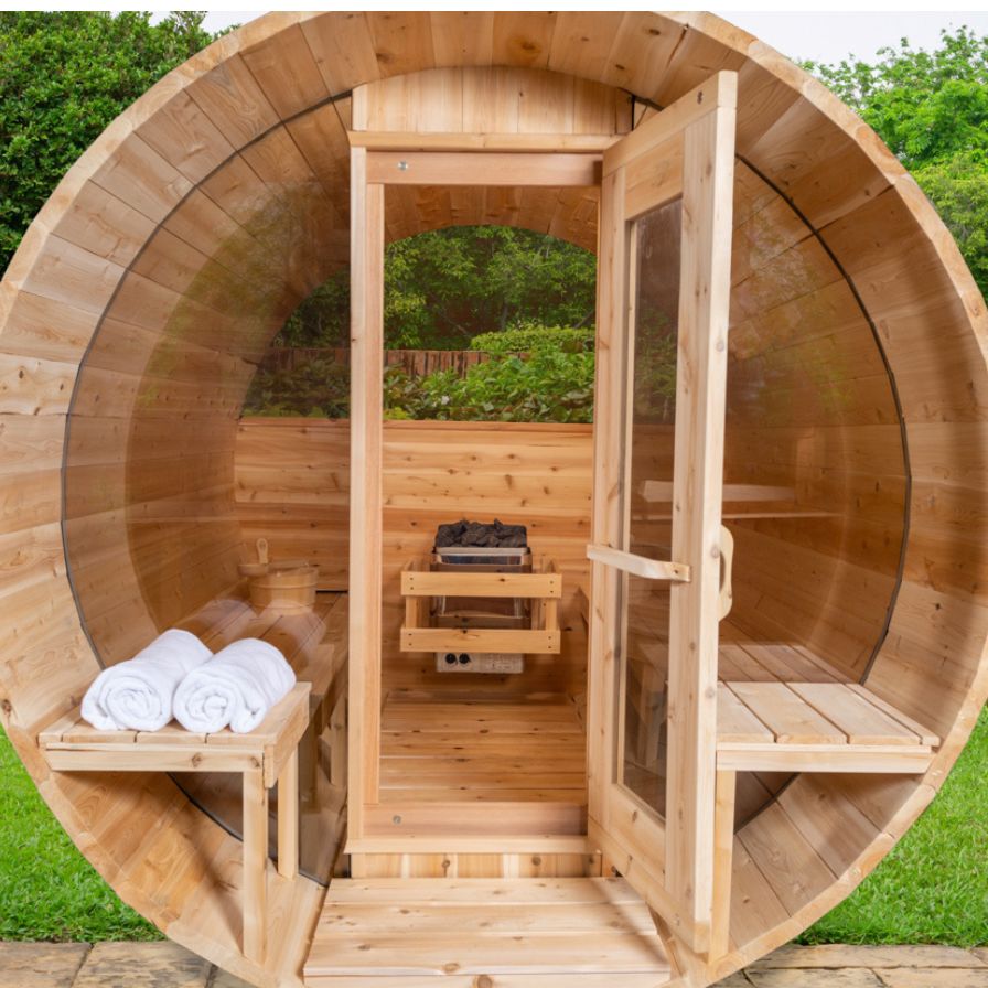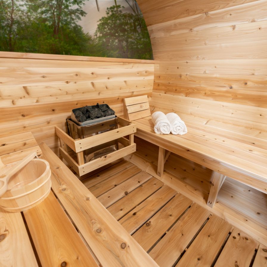 The Dundalk Leisurecraft Serenity MP Barrel Sauna is an outdoor cedar sauna designed for 3–4 people, blending traditional barrel styling with the natural warmth of Eastern White Cedar. Its curved design promotes efficient heat circulation while offering a cozy, inviting space for relaxation. Halfmoon windows add soft natural light and a connection to the outdoors, enhancing the overall sauna experience. A wood-burning heater option delivers authentic sauna heat, ideal for customers seeking a traditional approach to wellness. Crafted for outdoor use, the cedar construction weathers naturally over time, developing a silver-grey patina without affecting performance. Delivered as a complete kit for straightforward assembly, the Serenity MP Barrel Sauna combines timeless design and dependable functionality for backyard and cottage settings.