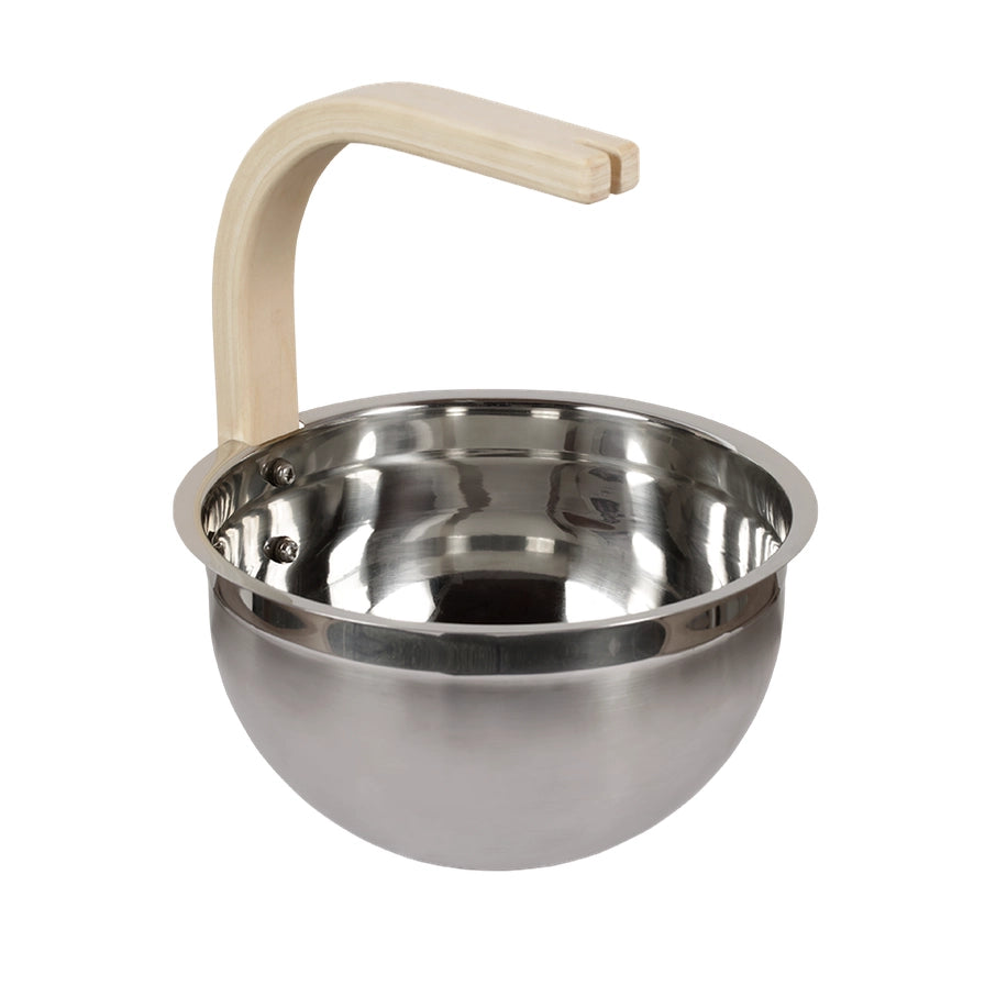 Stainless Steel Sauna Bucket with Curved Aspen Handle – 5L combines modern resilience with Nordic simplicity for a refined, long-lasting sauna essential. The brushed stainless steel basin resists rust and moisture, maintaining its clean appearance through daily heat and humidity, while the smoothly arched aspen handle provides natural insulation and a comfortable, balanced grip. With a 5-liter (1.32-gallon) capacity, it holds enough water for extended sessions or family use without constant refilling. The wide, rounded rim ensures steady, splash-controlled pours that create calm, even steam over the stones. Thoughtfully proportioned and easy to maintain, this bucket’s seamless construction and natural wood accent offer both visual harmony and dependable functionality—making it a reliable, beautifully understated companion for every sauna ritual.