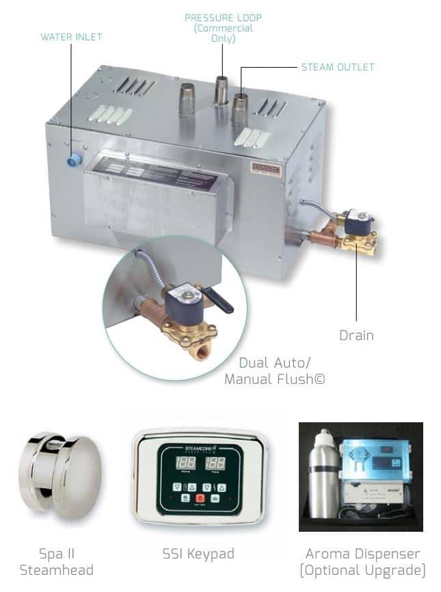 The Steamcore Pro-Series 22.5kW Steam Generator is designed for commercial settings like fitness centers, gyms, condos, hotels, and large residential steam showers. It features a surgical stainless steel boiler tank and industrial-grade heating elements for reliable performance. The automatic rinse and flush system ensures fresh water after each use, enhancing hygiene and longevity. Its compact design and energy-efficient operation make it a practical choice for high-demand environments.