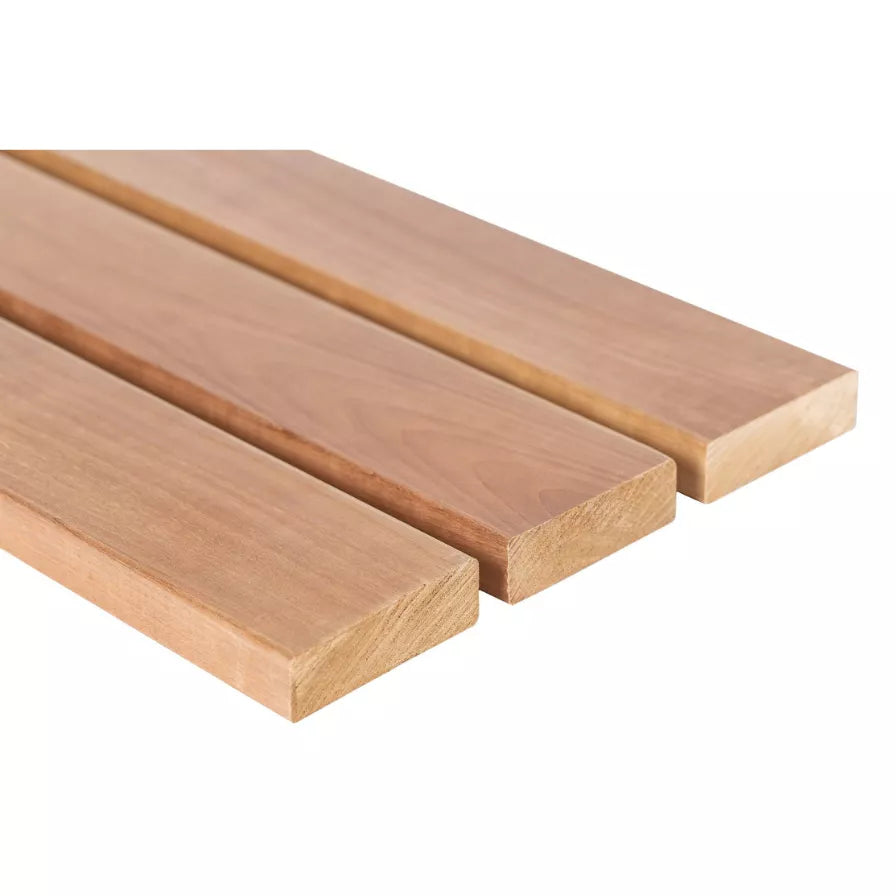 Thermo-Aspen SHP Sauna Wood - Bench Board 5/4×4 is composed of thermally modified, resin-free aspen that provides a robust, golden-brown surface with superior dimensional stability and low heat conductivity for high-temperature environments. This heavy-duty SHP profile features an increased 1.1" thickness and eased edges on all four sides, offering a substantial, premium feel and enhanced structural integrity for sauna seating and commercial-grade applications.