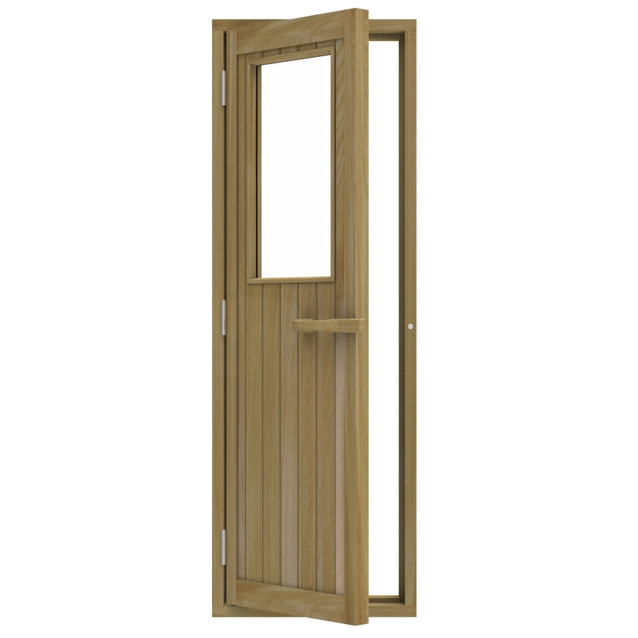 Western Red Cedar sauna door with a clear glass panel that brightens your hot room and stands up to real sauna conditions—this cedar-and-glass entry is the upgrade I recommend when you want durability, clean sightlines, and a welcoming feel. The naturally resilient cedar frame handles heat and humidity gracefully, while the clear glass lets light pass through so the room feels open, calm, and easy to navigate between rounds. Choose left- or right-hand hinging to fit your layout, install with the included hardware, and enjoy a door that looks timeless and works hard session after session.