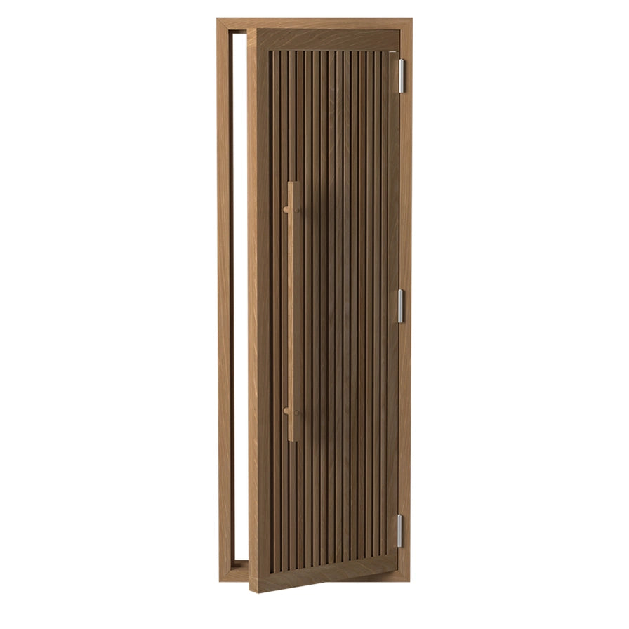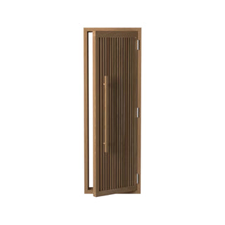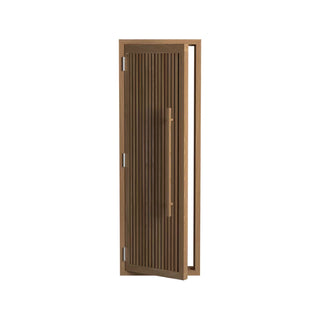 Cedar sauna door with a compact 24" × 76" footprint and a refined striped plank profile—this mid-height door brings warm, modern character to smaller saunas without crowding your layout. Premium cedar is the right choice for heat and humidity: it’s naturally aromatic, resists moisture, and stays comfortable to the touch through long sessions. Choose left- or right-hand swing at install so benches, heater clearance, and traffic flow all feel just right.